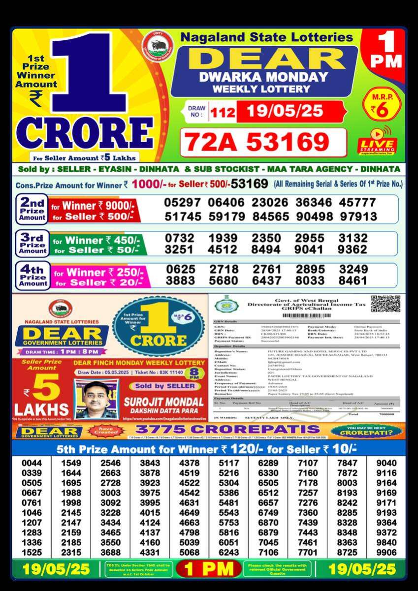Nagaland State Lottery 1PM Result for 19 May 2025 is Here. Check the 1PM Dear Lottery Results Live Today. Download the Results Image or print the result PDF For Free. The 1PM Results are Officially Released by the Nagaland State Lottery Through Live Draw on the YouTube channel.