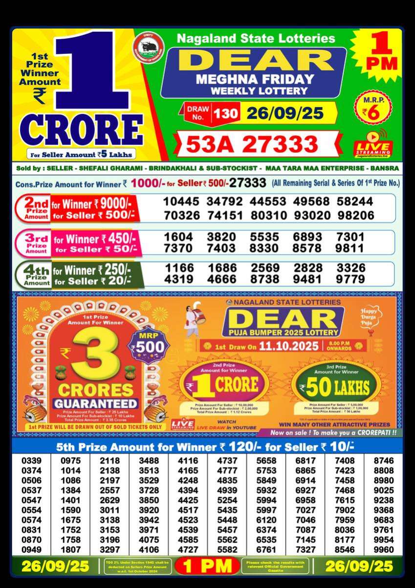 Nagaland State Lottery 1PM Result for 26 September 2025 is Here. Check the 1PM Dear Lottery Results Live Today. Download the Results Image or print the result PDF For Free. The 1PM Results are Officially Released by the Nagaland State Lottery Through Live Draw on the YouTube channel.
