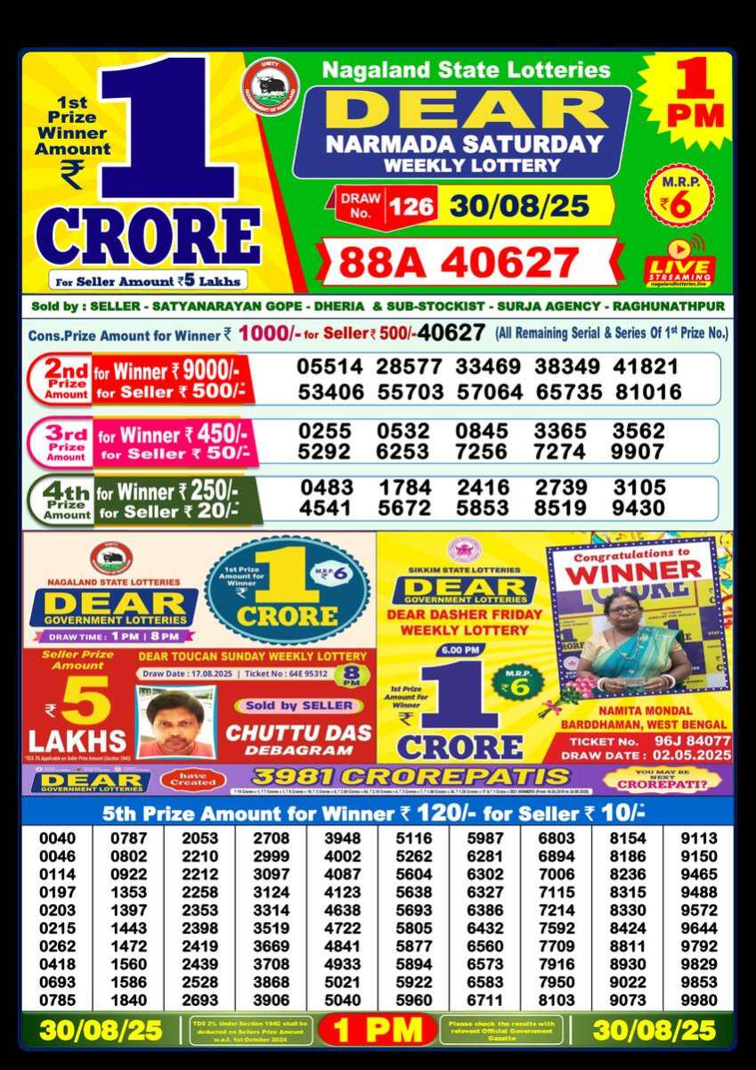Nagaland State Lottery 1PM Result for 30 August 2025 is Here. Check the 1PM Dear Lottery Results Live Today. Download the Results Image or print the result PDF For Free. The 1PM Results are Officially Released by the Nagaland State Lottery Through Live Draw on the YouTube channel.