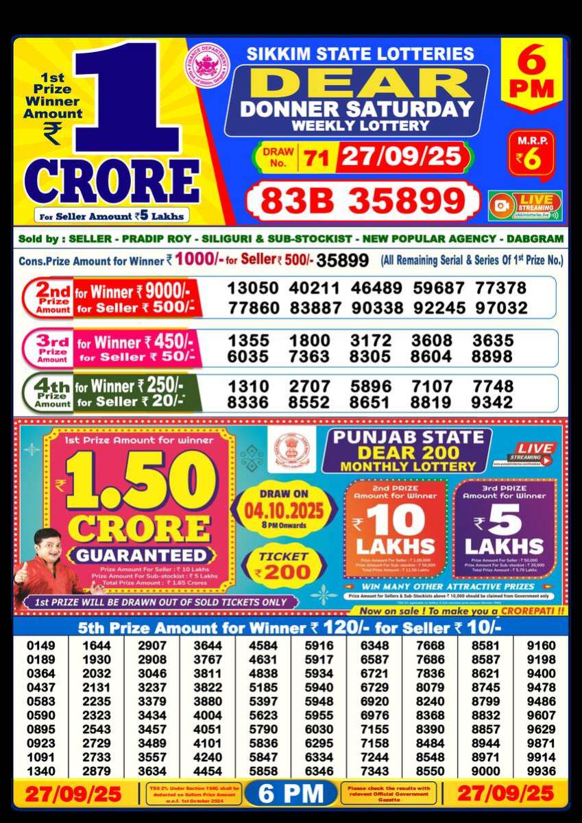 Dear Lottery 6PM Result (27 September 2025)