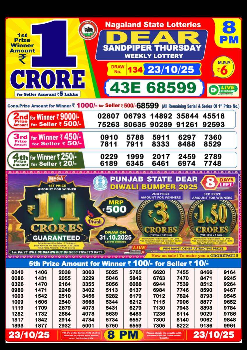 Nagaland State Lottery 8PM Result for 23 October 2025 is Here. Check the 8PM Dear Lottery Results Live Today. Download the Results Image or print the result PDF For Free. The 8PM Results are Officially Released by the Nagaland State Lottery Through Live Draw on the YouTube channel.