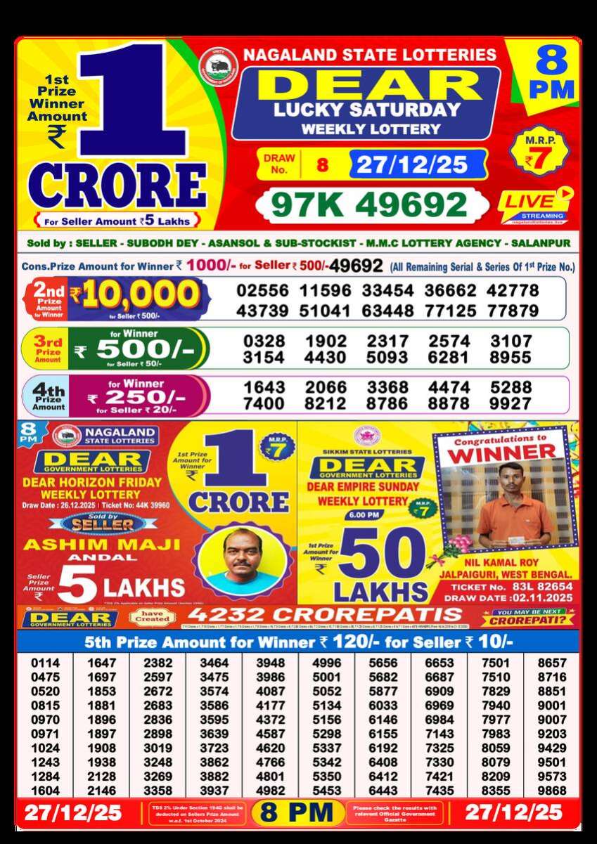Nagaland State Lottery 8PM Result for 27 December 2025 is Here. Check the 8PM Dear Lottery Results Live Today. Download the Results Image or print the result PDF For Free. The 8PM Results are Officially Released by the Nagaland State Lottery Through Live Draw on the YouTube channel.